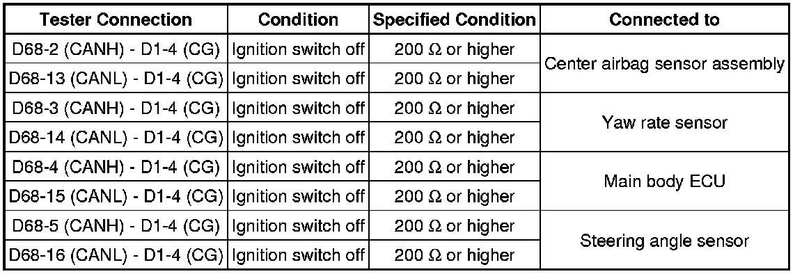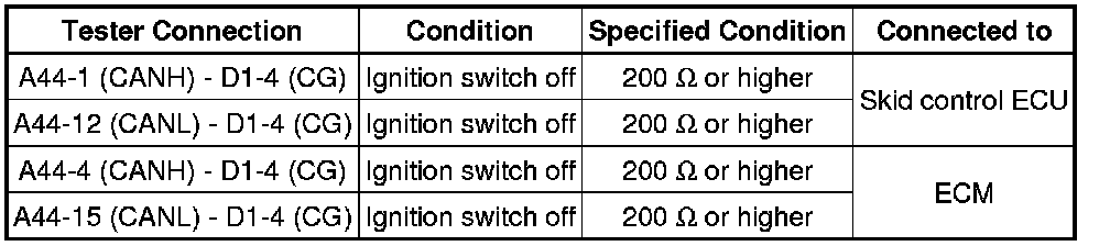 There may be a short circuit between the CAN bus main wire and GND when there is no resistance between terminals 6 (CANH) and 4 (CG) or 14 (CANL) and 4 (CG) of the DLC3.