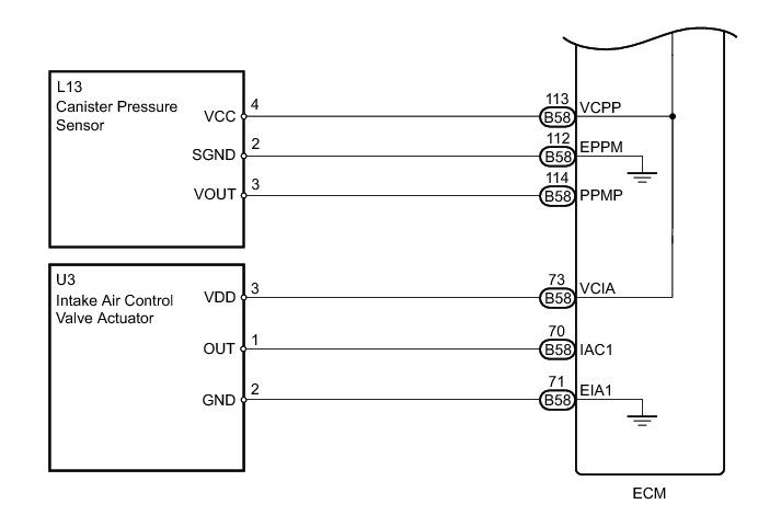 The ECM constantly generates 5 V of power from battery voltage supplied to the +B (BATT) terminal to operate the microprocessor. The ECM also provides this power to the sensors through the VC output circuit.