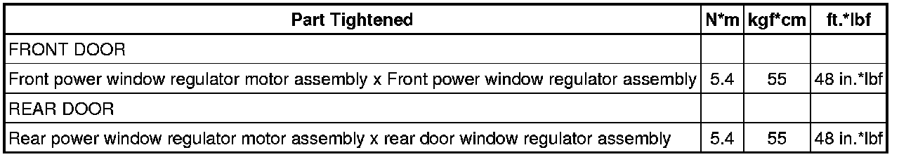 SPECIFICATIONS: WINDOW / GLASS: TORQUE SPECIFICATIONS