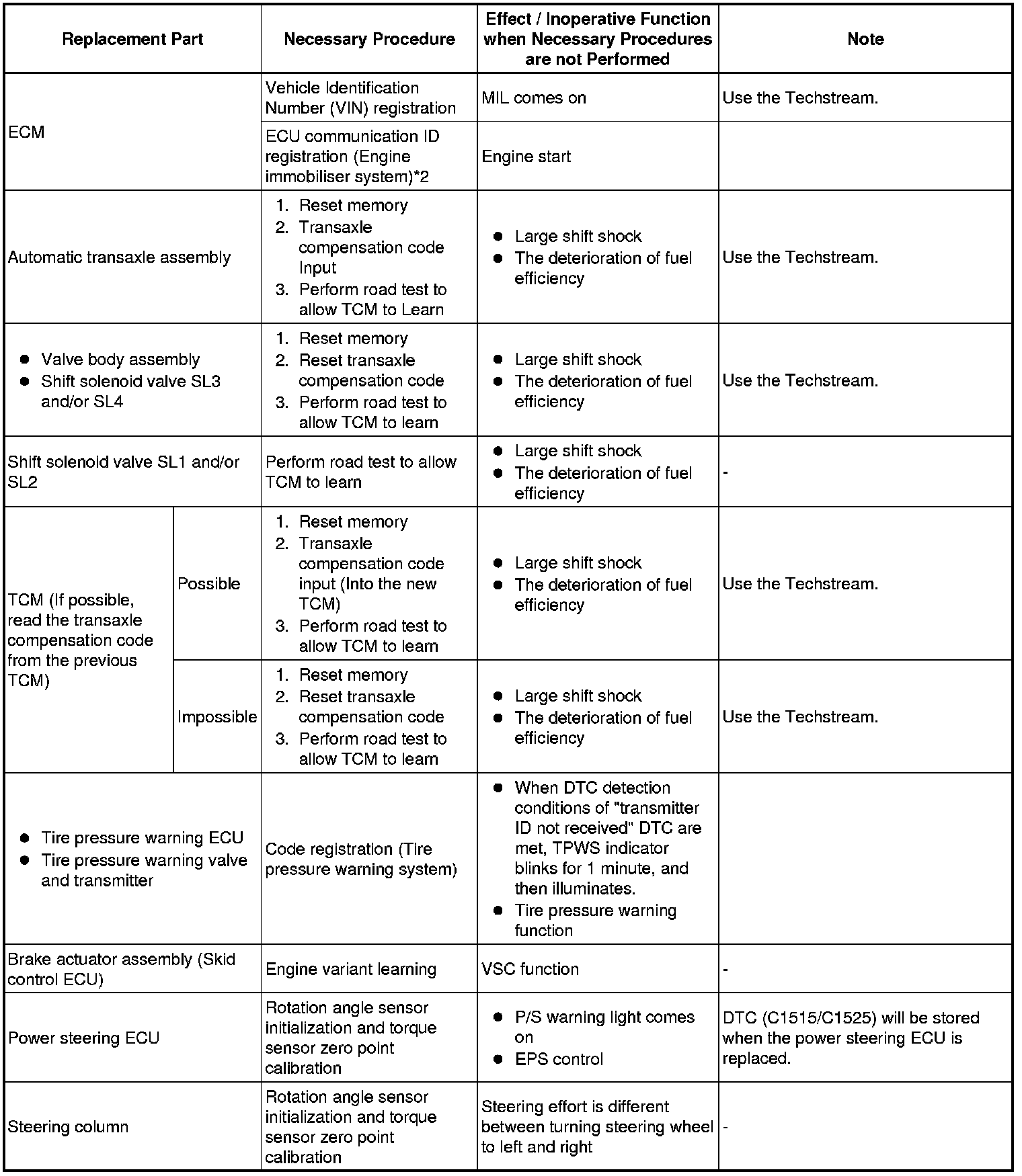 Therefore, when the automatic transaxle assembly, valve body assembly, shift solenoid valve SL3, shift solenoid valve SL4, or TCM has been replaced, it is necessary to reset the memory so that the TCM can memorize the new information.