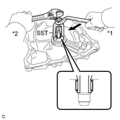 (a) Using SST, remove the counter driven gear front tapered roller bearing outer race and shim from the transaxle housing.
