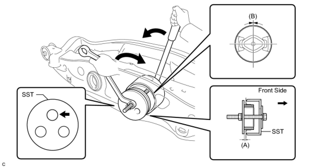 * Temporarily install the rear No. 2 differential mount cushion to the rear suspension member before installing SST to prevent the rear No. 2 differential mount cushion from being tilted.