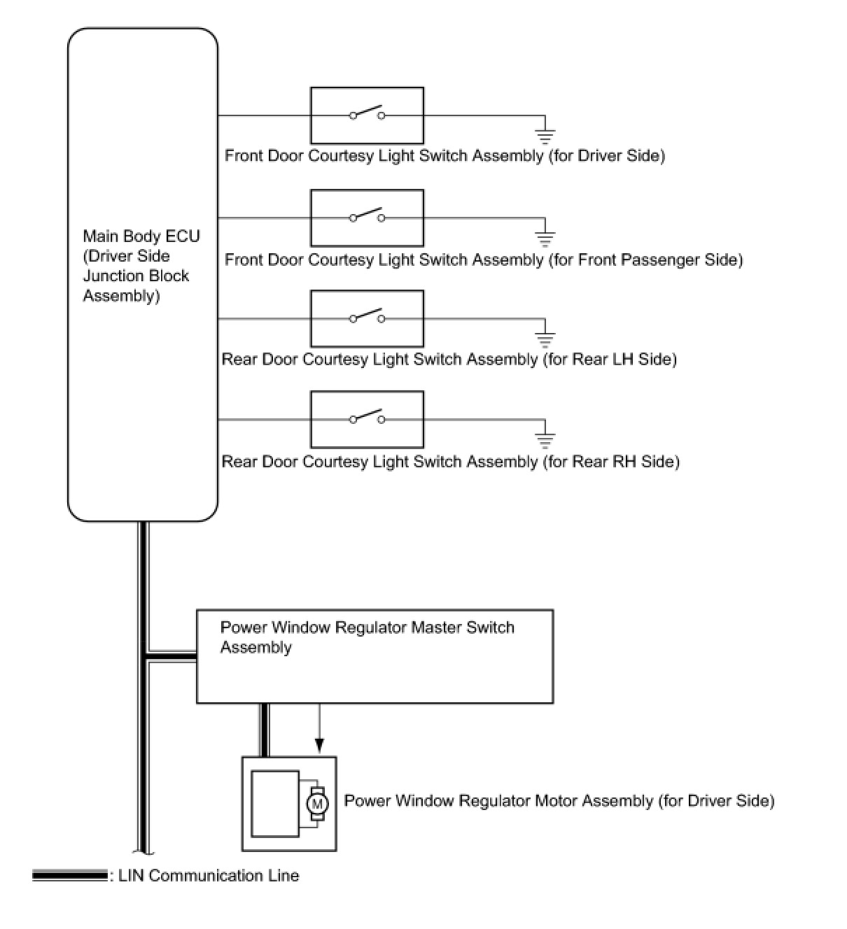 (a) The power window control system controls the power window operation using the power window regulator motors. The main controls of this system are the power window regulator master switch assembly, which is mounted on the driver side door, and the power window regulator switches, which are mounted on the front passenger side door and rear doors. Operating a window switch results in electrical power being transmitted to the corresponding power window regulator motor.
