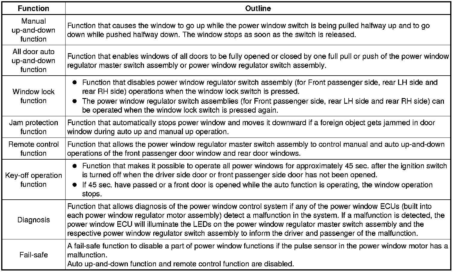 The power window control system has the following functions: