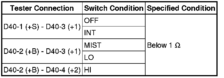 (5) Connect a battery negative (-) lead to terminal D40-1 (+S). Operate the intermittent wiper relay and check the voltage between terminals D40-3 (+1) and D39-2 (EW).