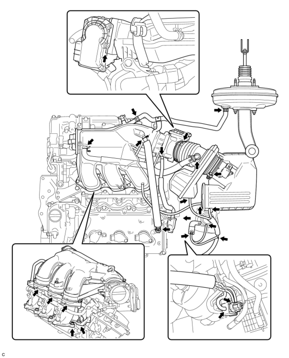 Check that there are no vacuum leaks at the points shown in the illustration.