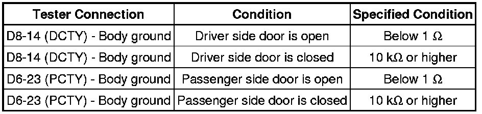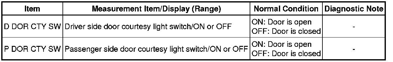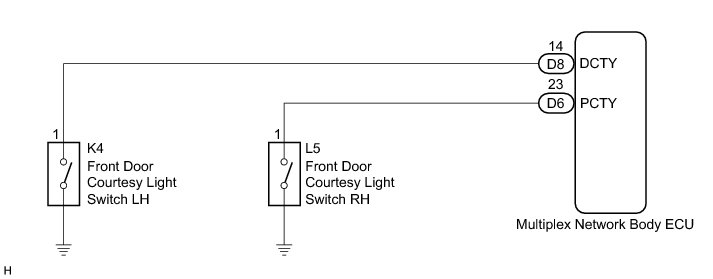 The multiplex network body ECU detects the door open or closed status based on signals from the front door courtesy light switches, and operates the automatic lock and door ajar warning functions.