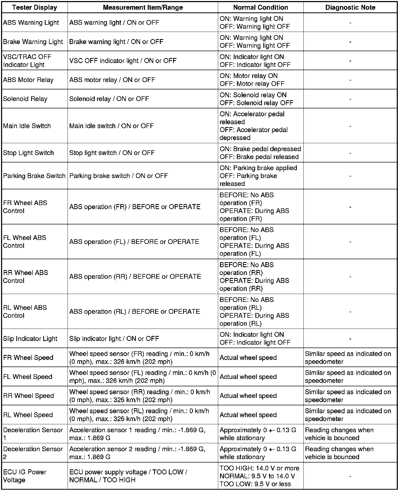 Using the Techstream connected to the DLC3 and the ignition switch on (IG), the ABS, TRAC and VSC Data List can be displayed. Follow the prompts on the Techstream screen to read the Data List.
