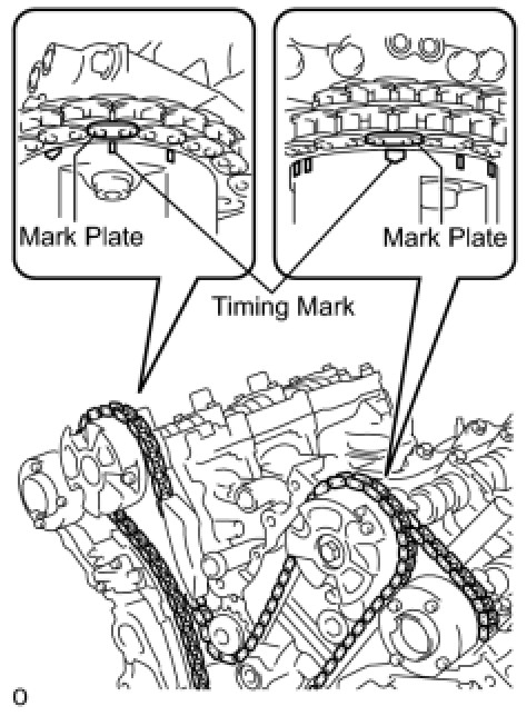 (d) Align the mark plate and timing marks as shown in the illustration and install the chain onto the crankshaft timing sprocket.