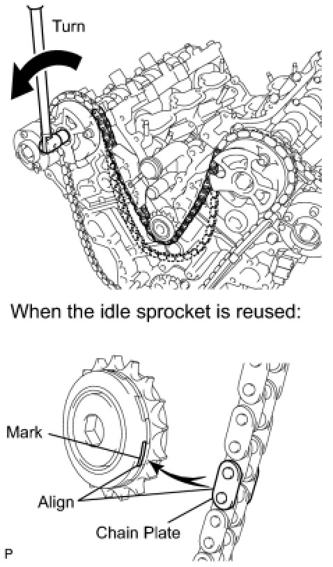 When the idle sprocket assembly is reused, align the chain plate with the mark where the plate had been in order to tighten the chain between the banks.