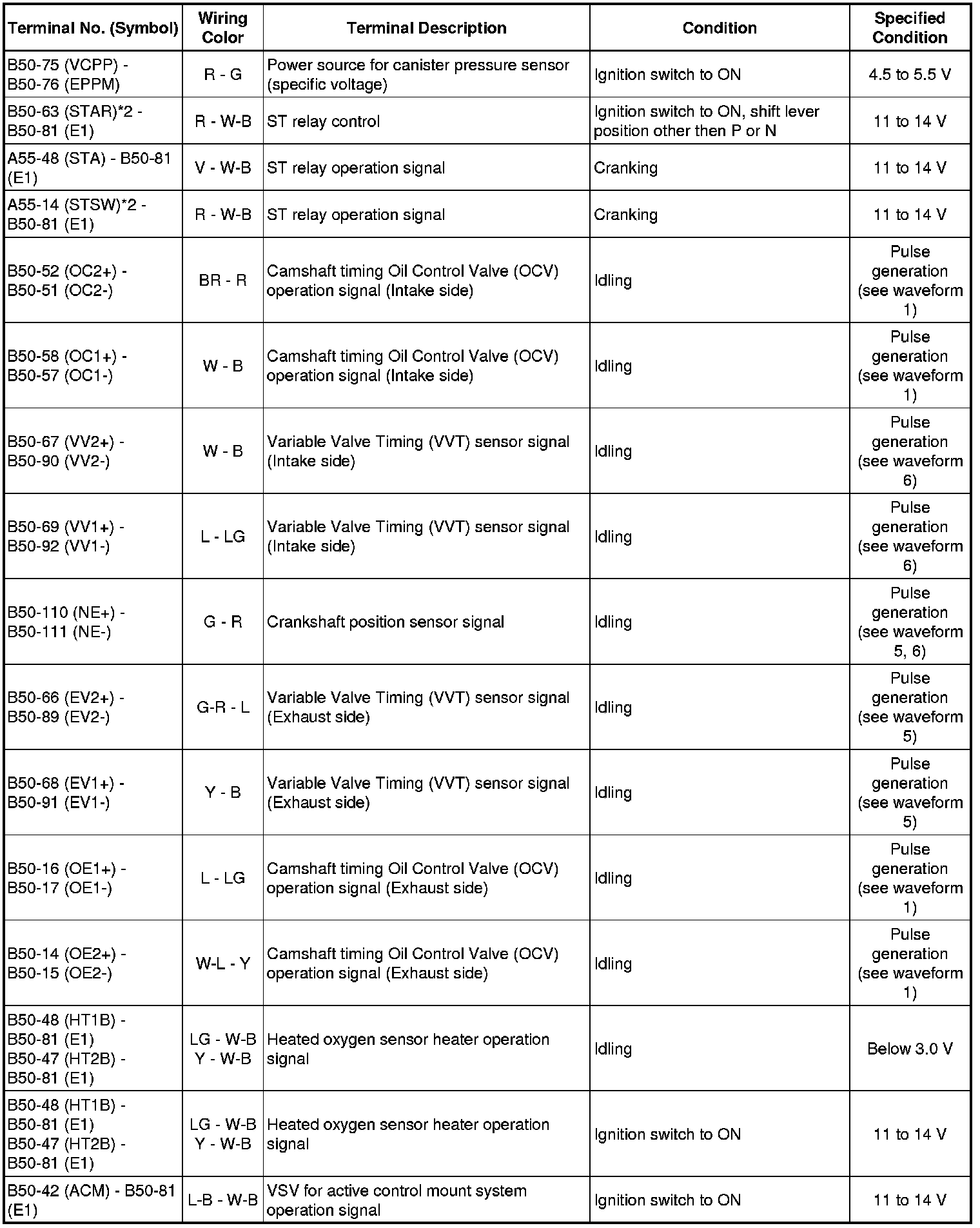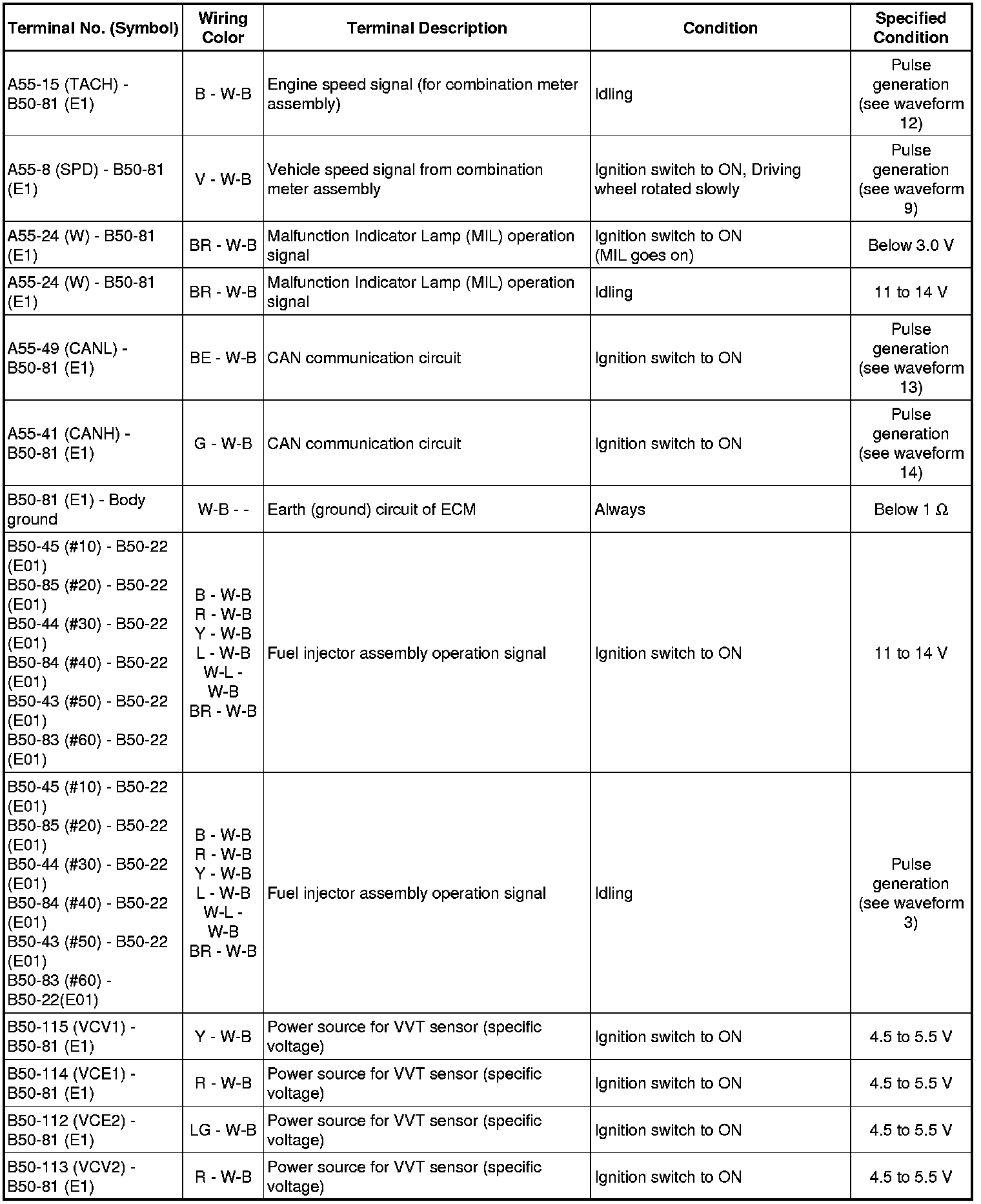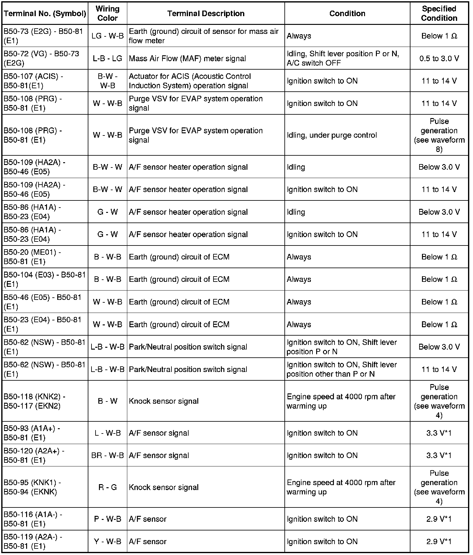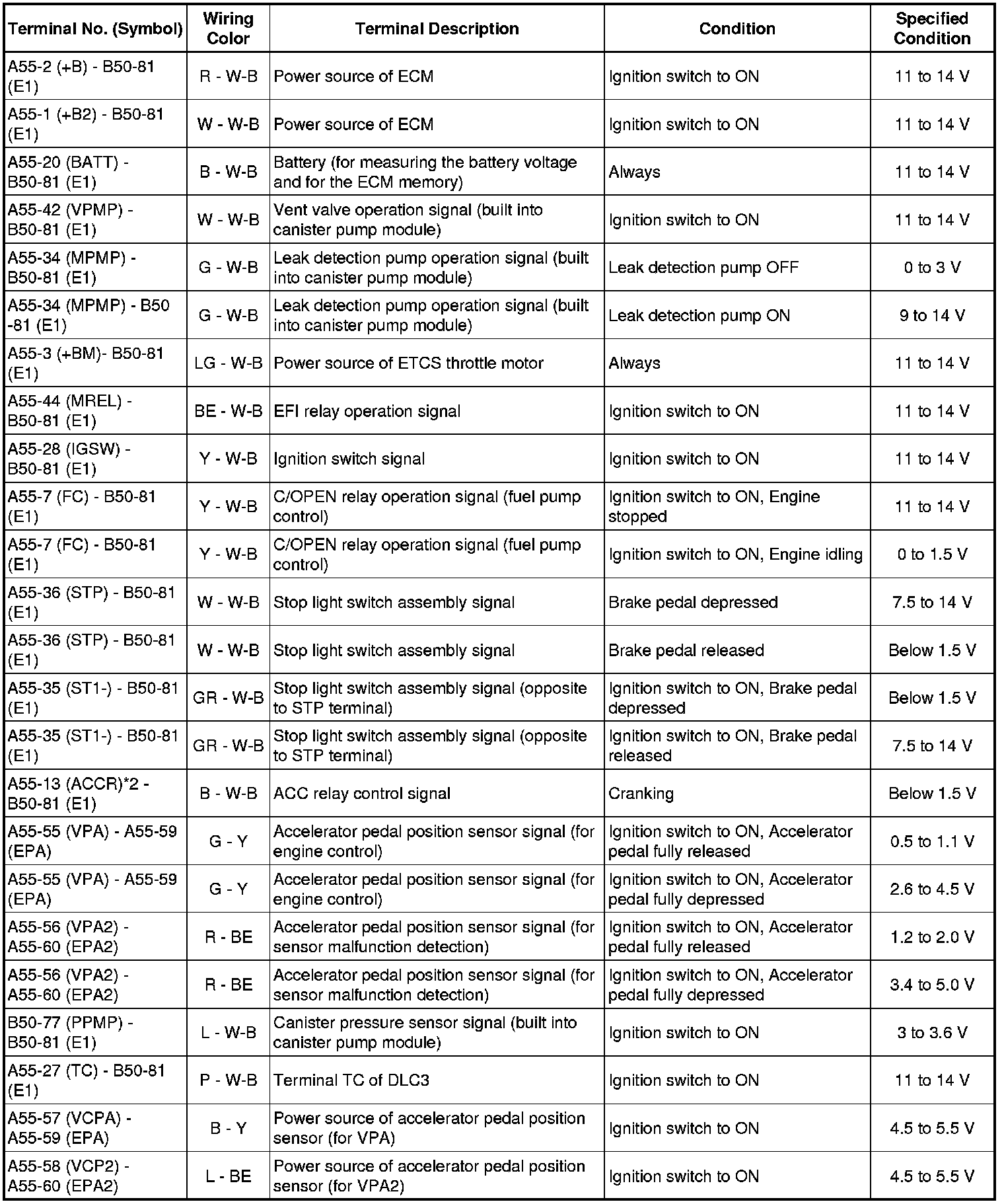 The standard normal voltage between each pair of the ECM terminals is shown in the table below. The appropriate conditions for checking each pair of the terminals are also indicated.