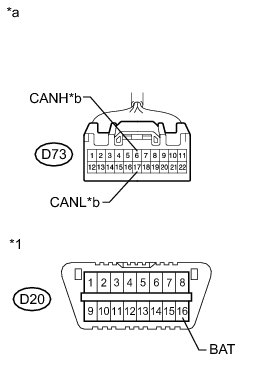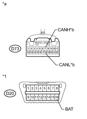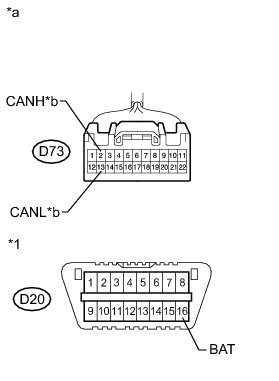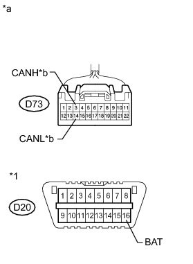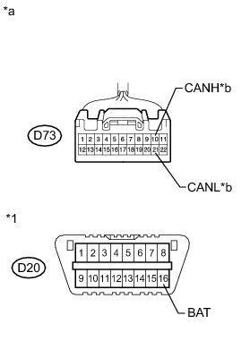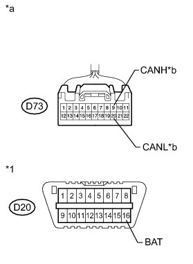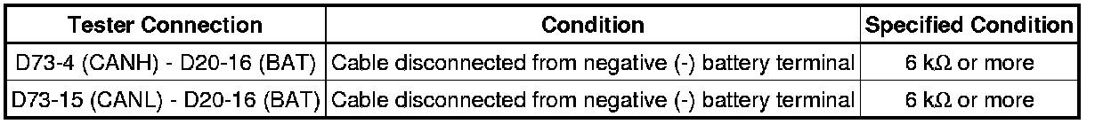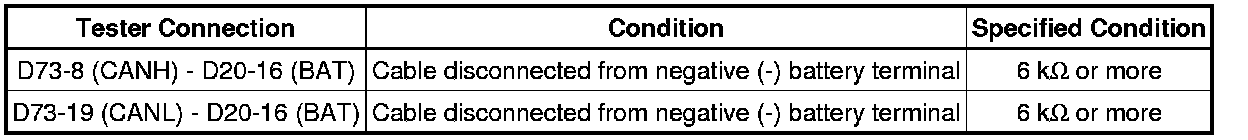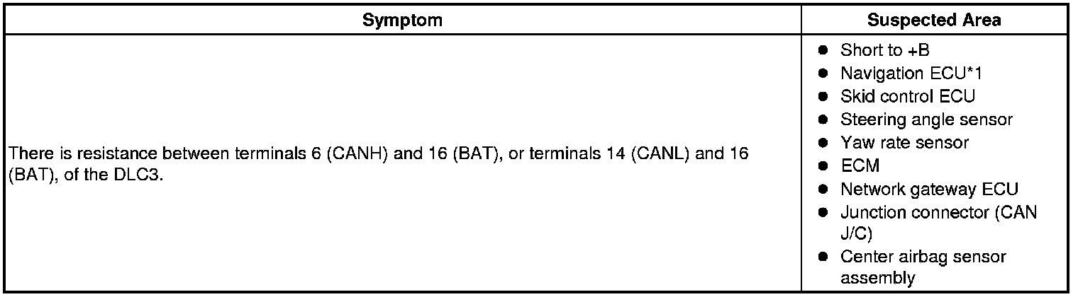 There may be a short circuit between one of the CAN bus lines and +B when there is resistance between terminals 6 (CANH) and 16 (BAT), or terminals 14 (CANL) and 16 (BAT), of the DLC3.