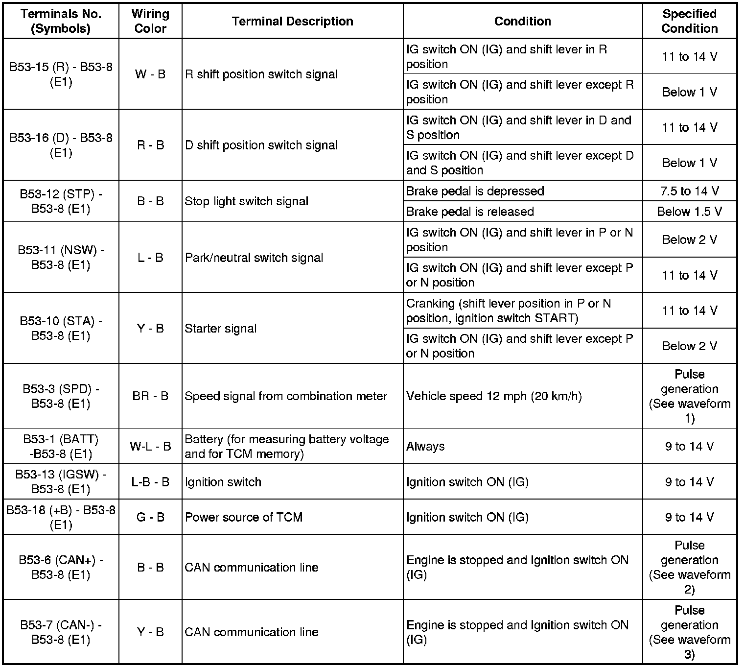 In the table, first follow the information under "Condition". Look under "Terminals No. (Symbols)" for the terminals to be inspected. The standard voltage between the terminals is shown under "Specified Condition".