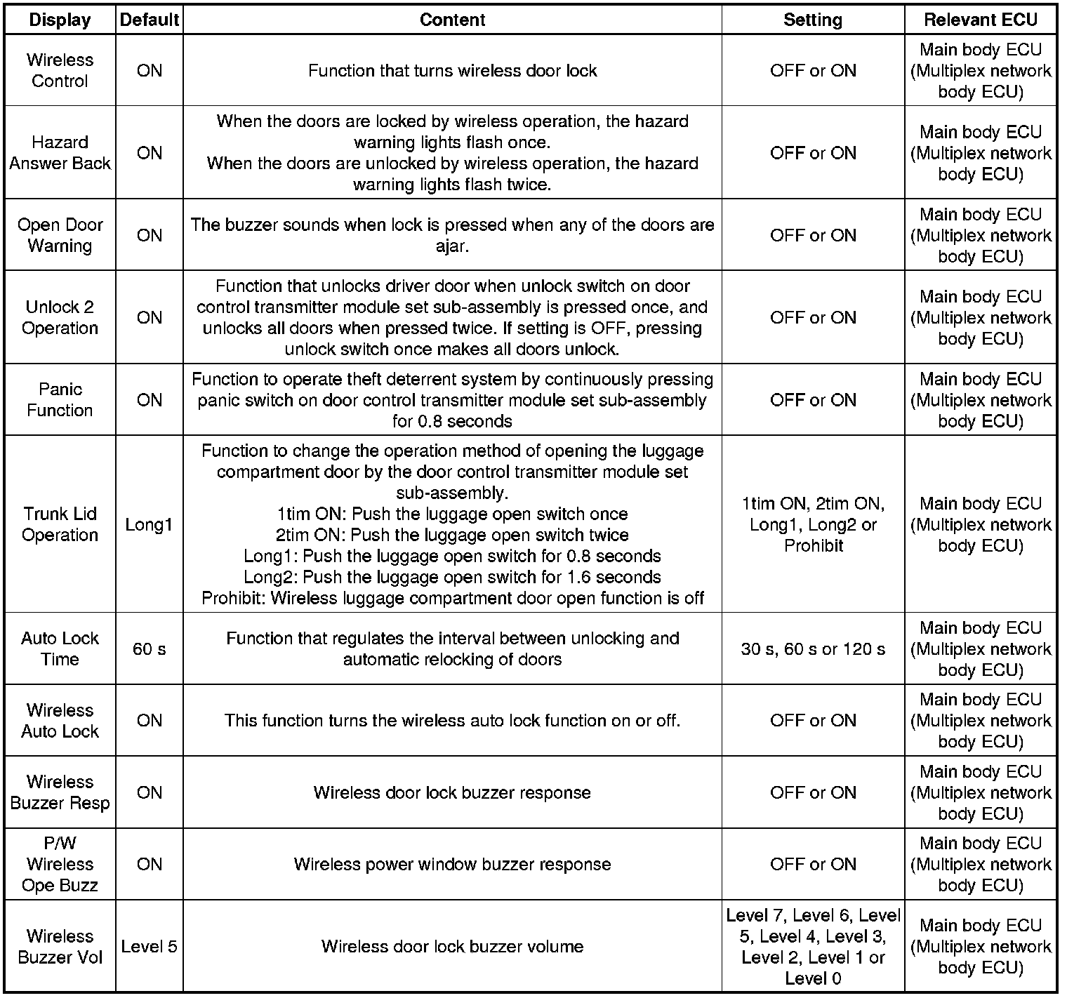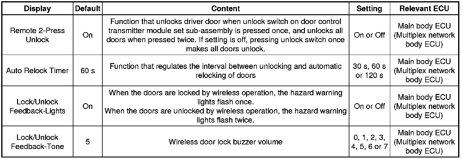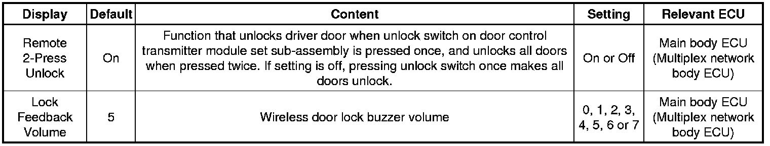 DOOR LOCK: WIRELESS DOOR LOCK CONTROL SYSTEM (w/o Smart Key System): CUSTOMIZE PARAMETERS