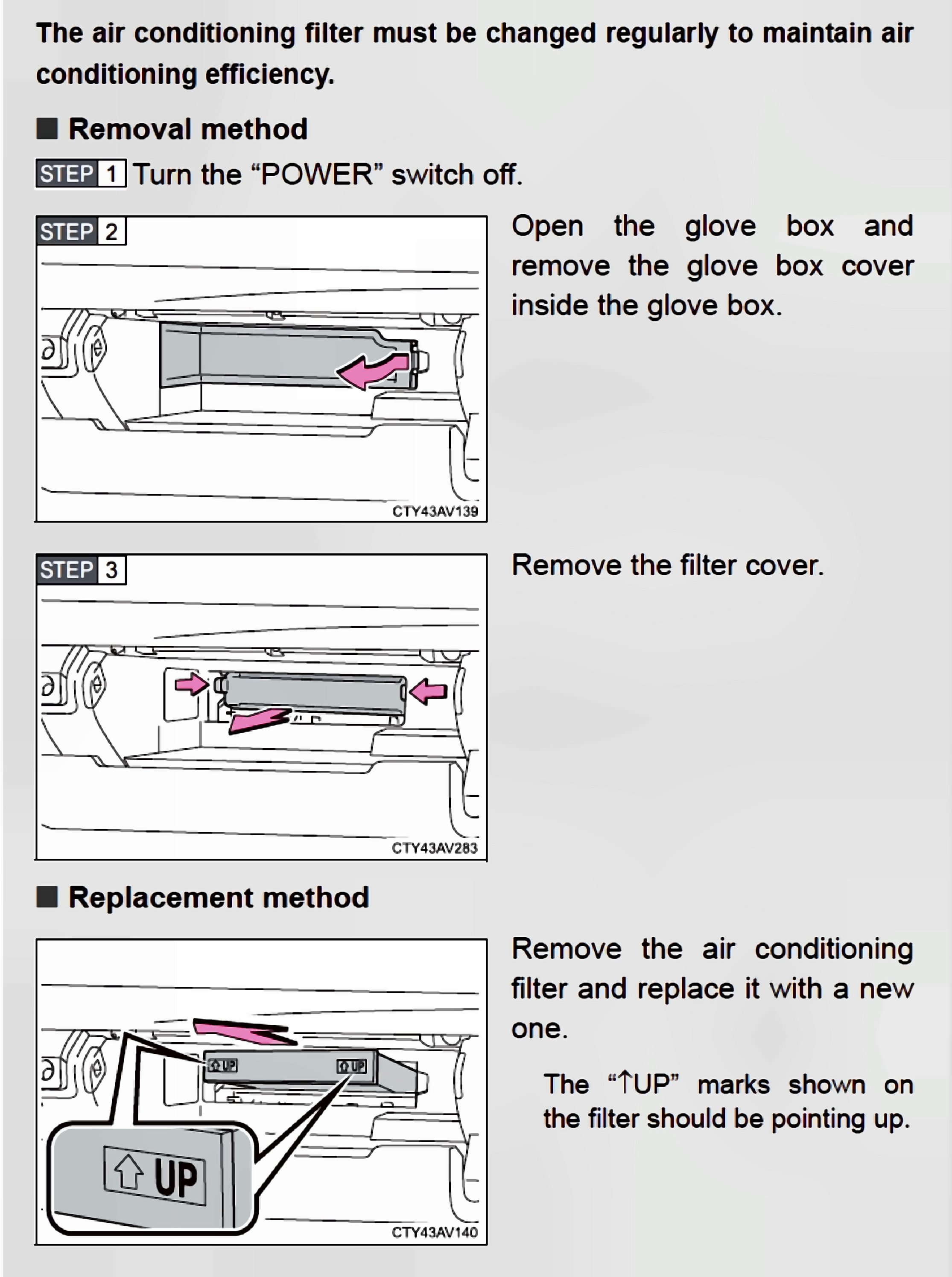 Inspect and replace the air conditioning filter according to the maintenance schedule. In dusty areas or areas with heavy traffic flow, early replacement may be required.