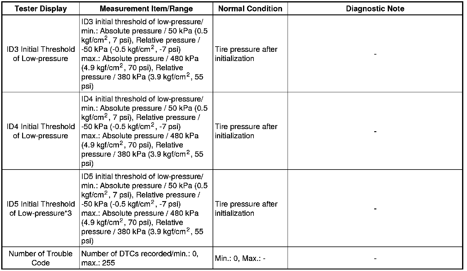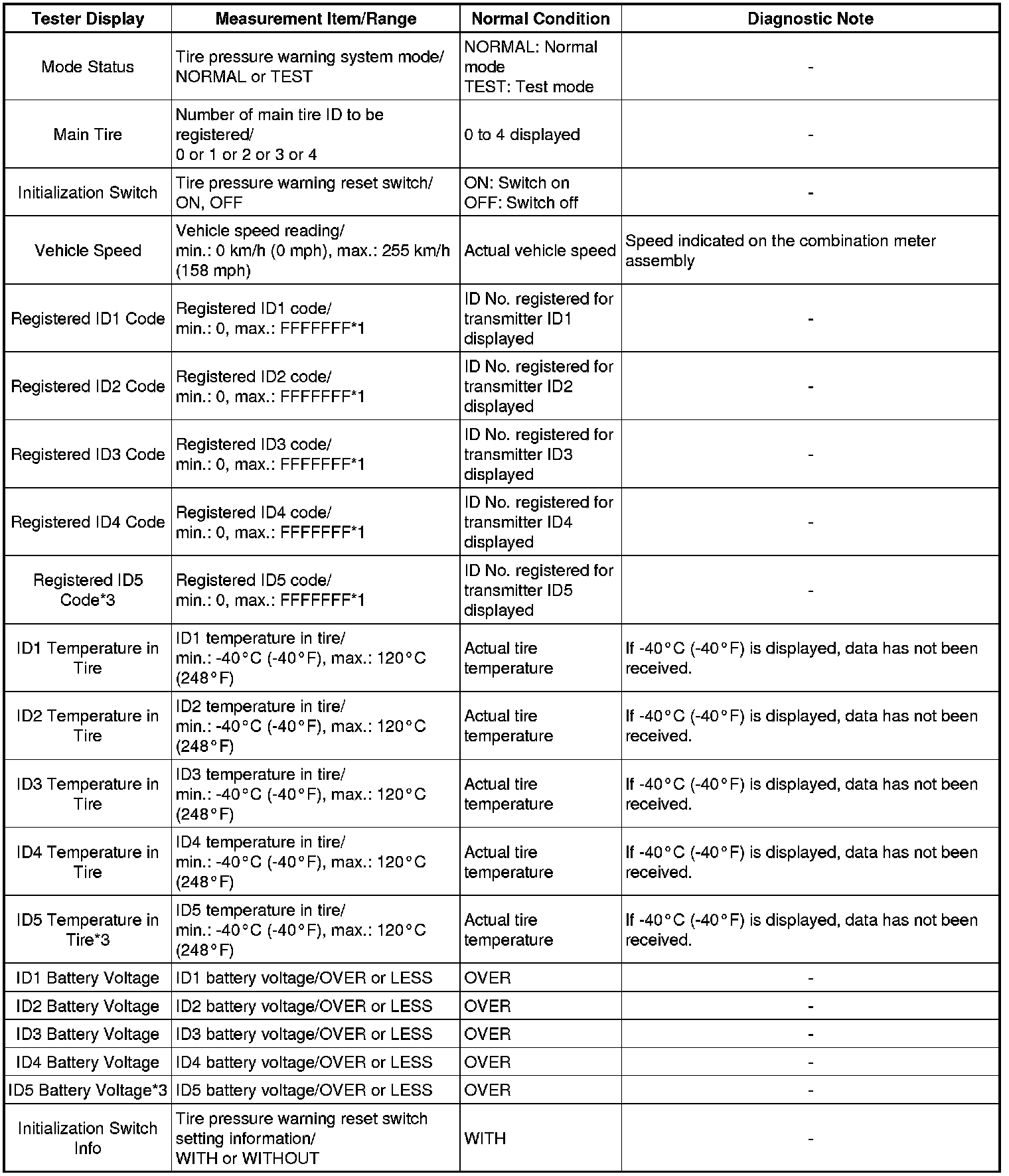 *2: It may take a few minutes until the values are displayed. If the values are not displayed after a few minutes, perform troubleshooting according to the inspection procedure for DTCs C2121/21 to C2124/24 Transmitter ID4 not Received (Test Mode DTC) - Tire Pressure Monitoring.