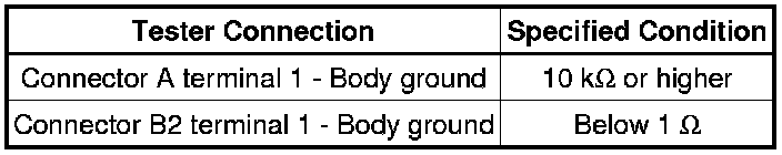 * If the results match the values specified above, an open circuit exists between terminal 1 of connector B2 and terminal 1 of connector C.