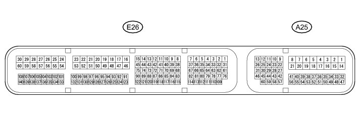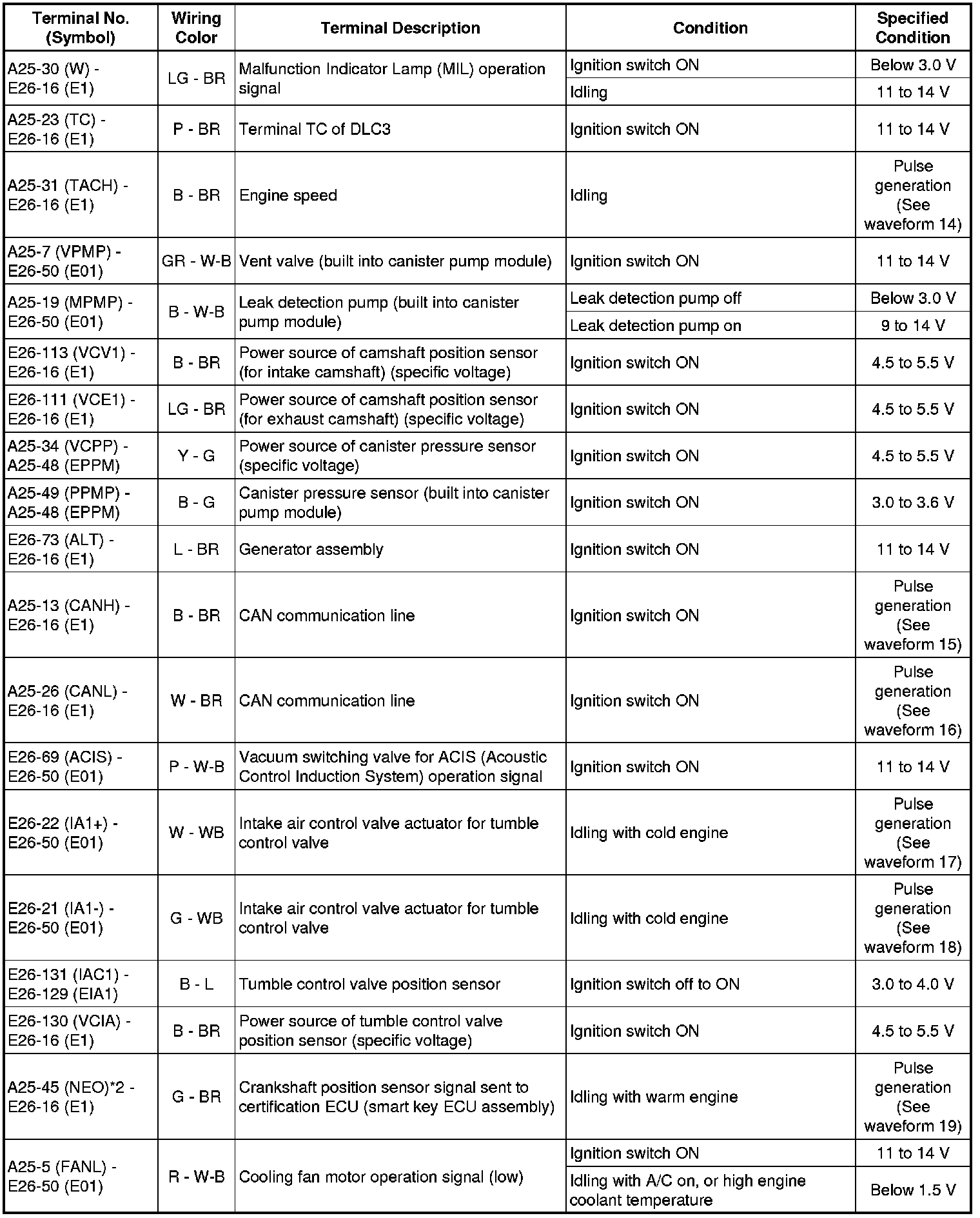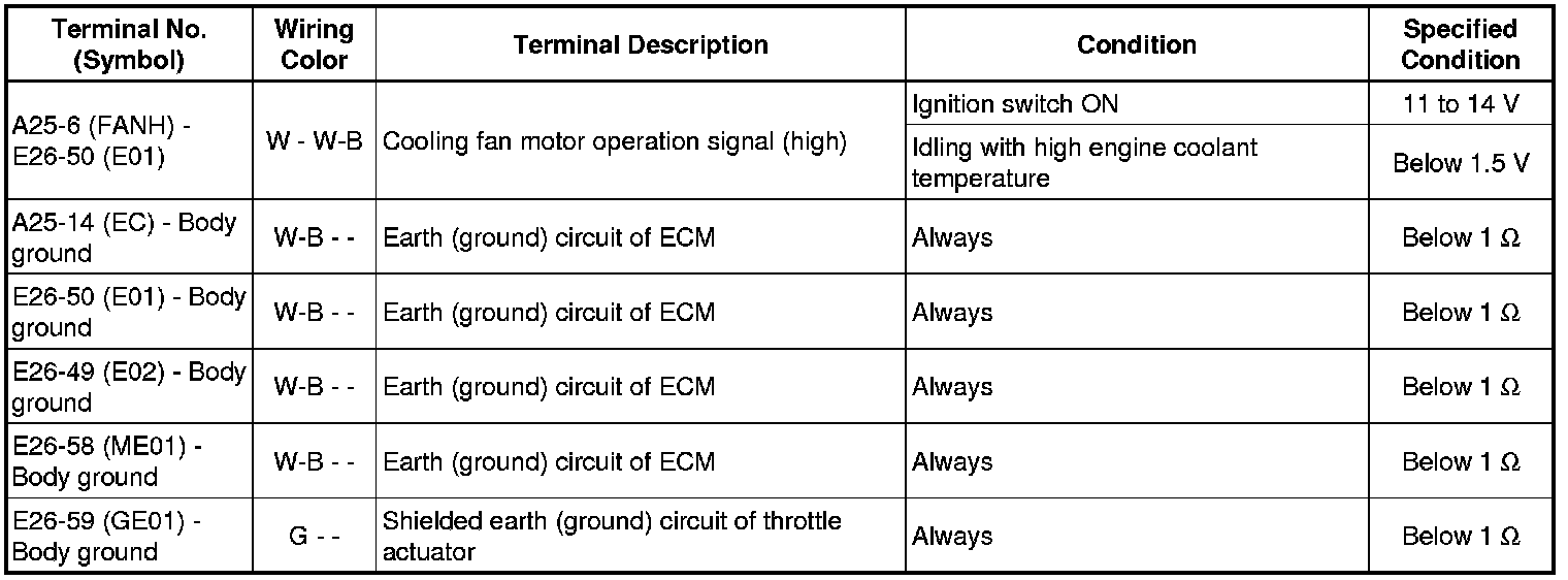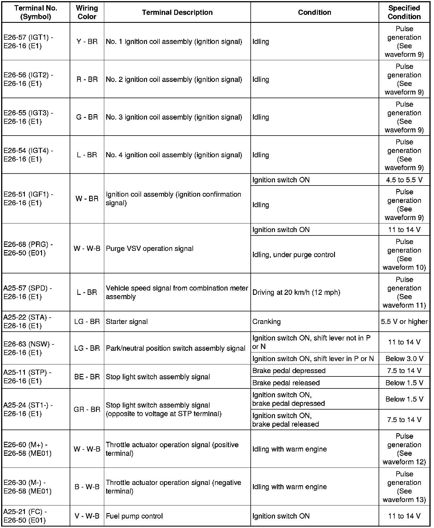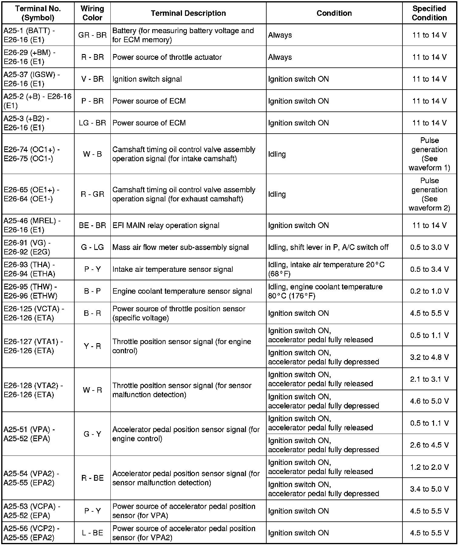 The standard voltage between each pair of ECM terminals is shown in the table below. The appropriate conditions for checking each pair of terminals are also indicated. The result of checks should be compared with the standard voltage for that pair of terminals, displayed in the "Specified Condition" column. The illustration above can be used as a reference to identify the ECM terminal locations.