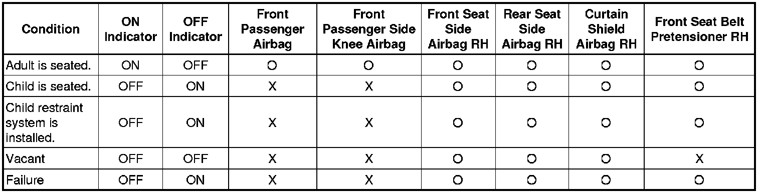 * Approximately 6 seconds after the ignition switch is turned to ON, the passenger airbag ON/OFF indicator will indicate ON or OFF depending on the conditions listed below.