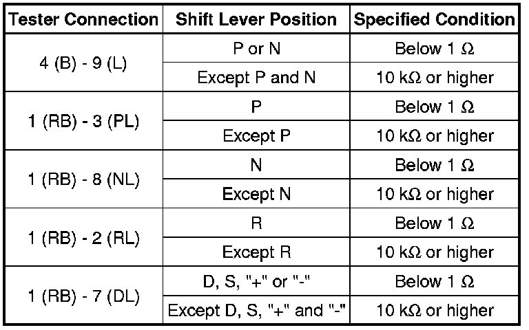 (a) Measure the resistance according to the value(s) in the table below when the shift lever is moved to each position.