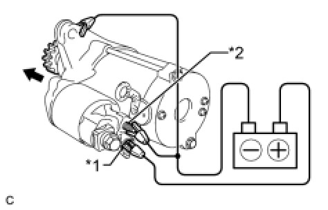 (1) While maintaining the battery connections of the pull-in test above, disconnect the negative (-) lead from terminal C. Check that the pinion gear remains extended.