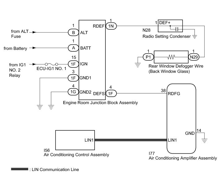 When the rear window defogger switch on the air conditioning control assembly is pressed, the operation signal is transmitted to the air conditioning amplifier assembly through a LIN communication line. When the air conditioning amplifier assembly receives the signal, it turns on the engine room junction block assembly to operate the rear window defogger.