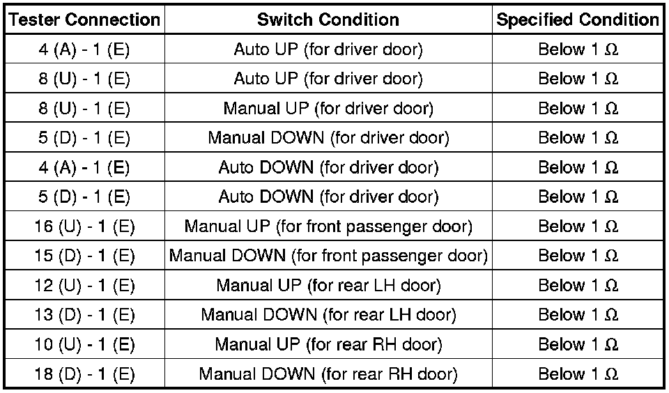 If the result is not as specified, replace the power window regulator master switch assembly.