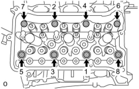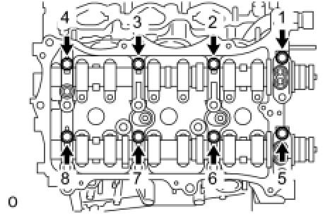 Temporarily tighten the 8 bearing cap bolts in the order shown in the illustration.