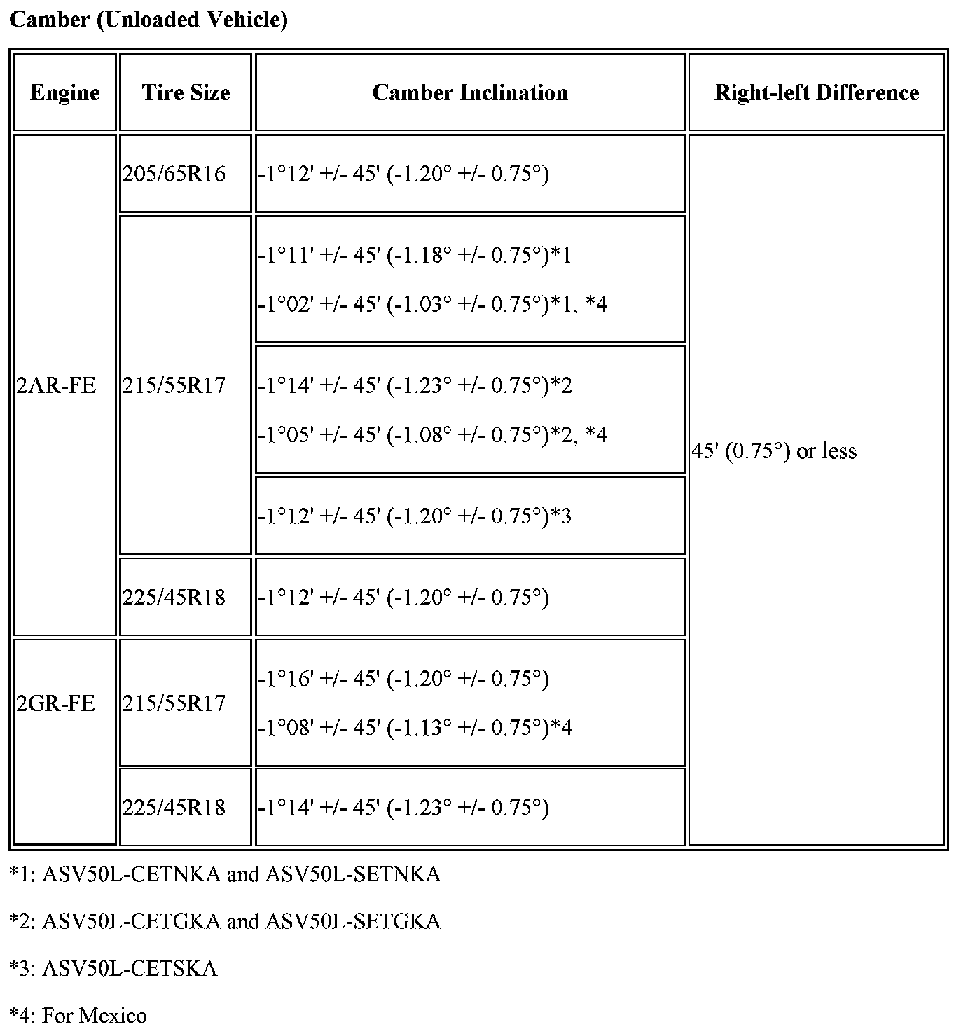 HINT: Camber is not adjustable. If the measurement is not within the specified range, inspect the suspension parts for damage and/or wear, and replace them if necessary.