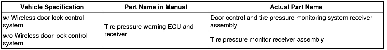 (a) The type of tire pressure warning ECU and receiver used on this model differs according to the specifications of the vehicle. The expressions listed in the table below are used in this section.