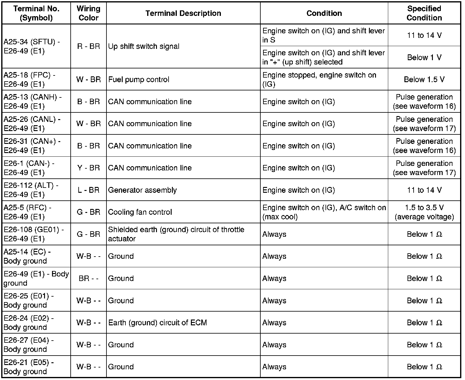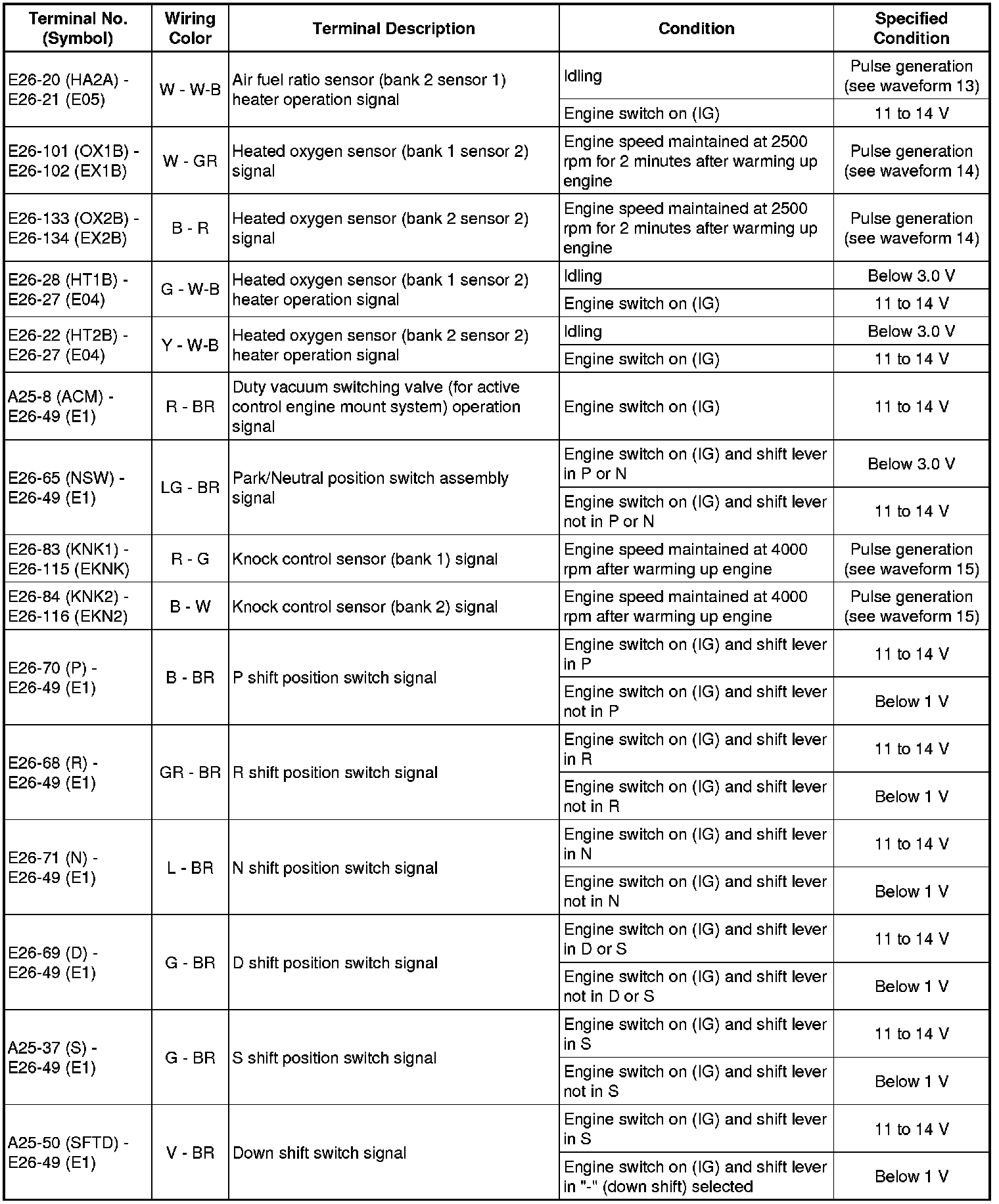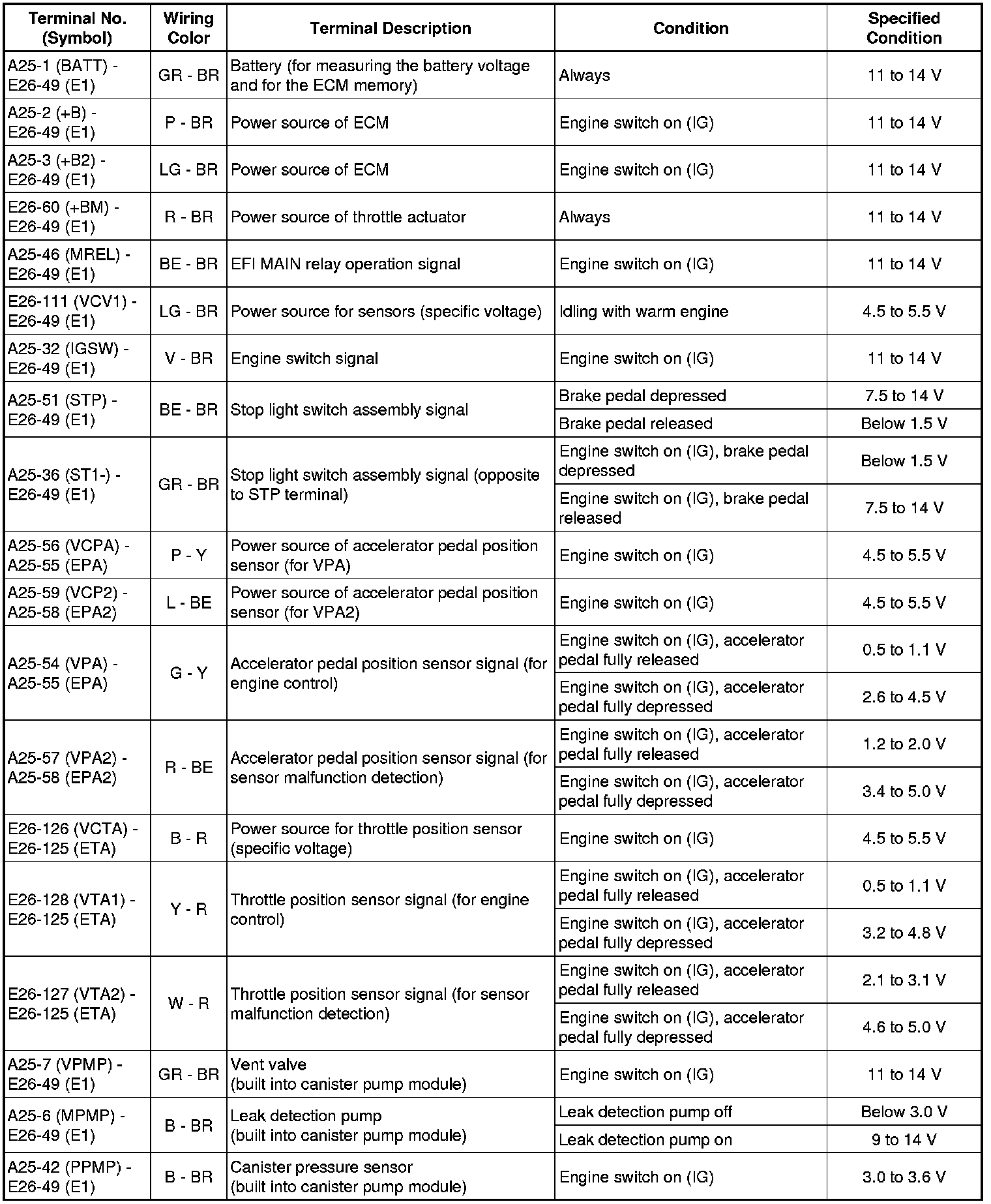 The standard voltage between each pair of the ECM terminals is shown in the table below. The appropriate conditions for checking each pair of the terminals are also indicated.