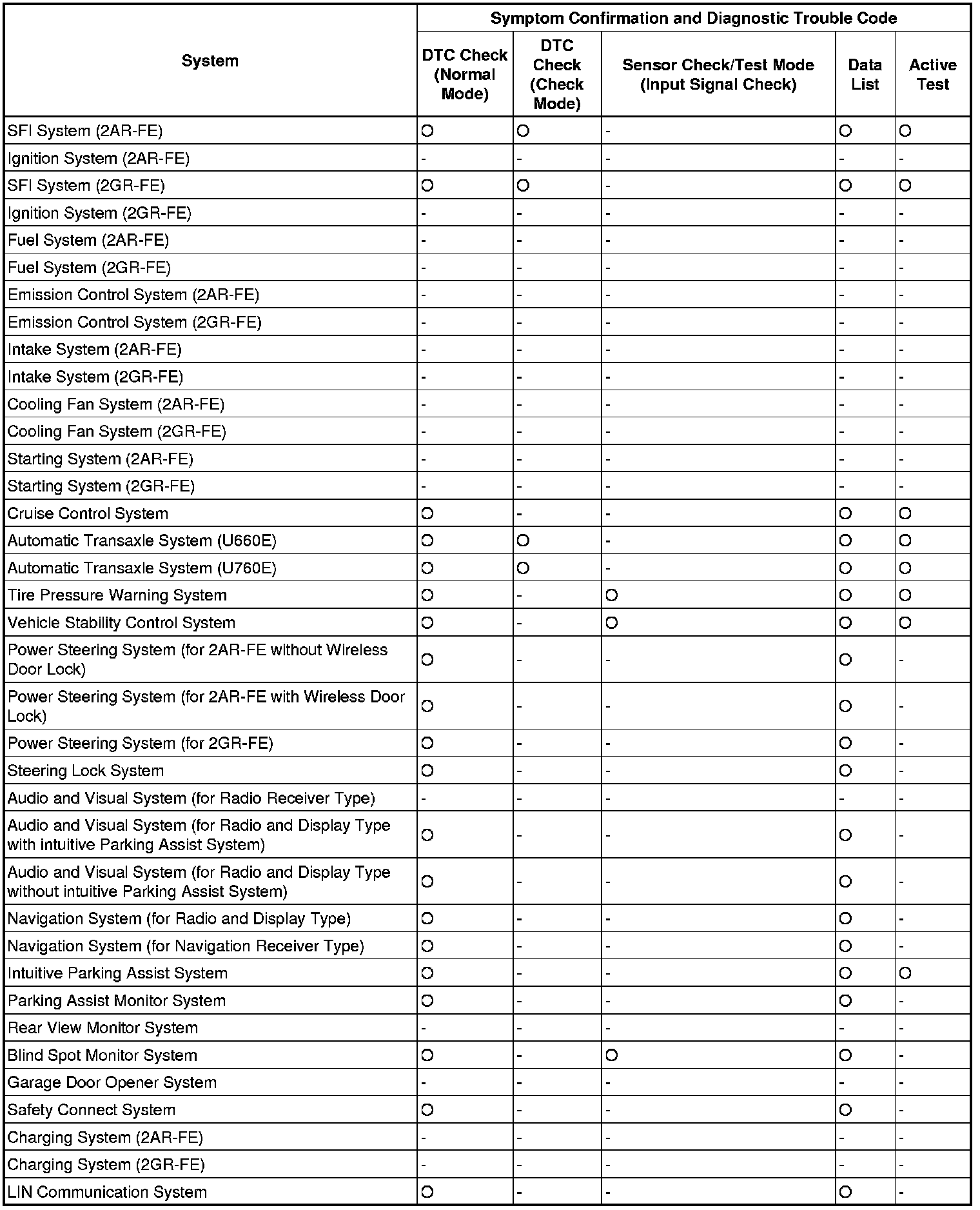When no DTC is output but the problem still occurs, use the Problem Symptoms Table. The suspected areas (circuits or parts) for each problem symptom are shown in the table. The suspected areas are listed in order of probability. A description of each of the table columns is shown in the following table.