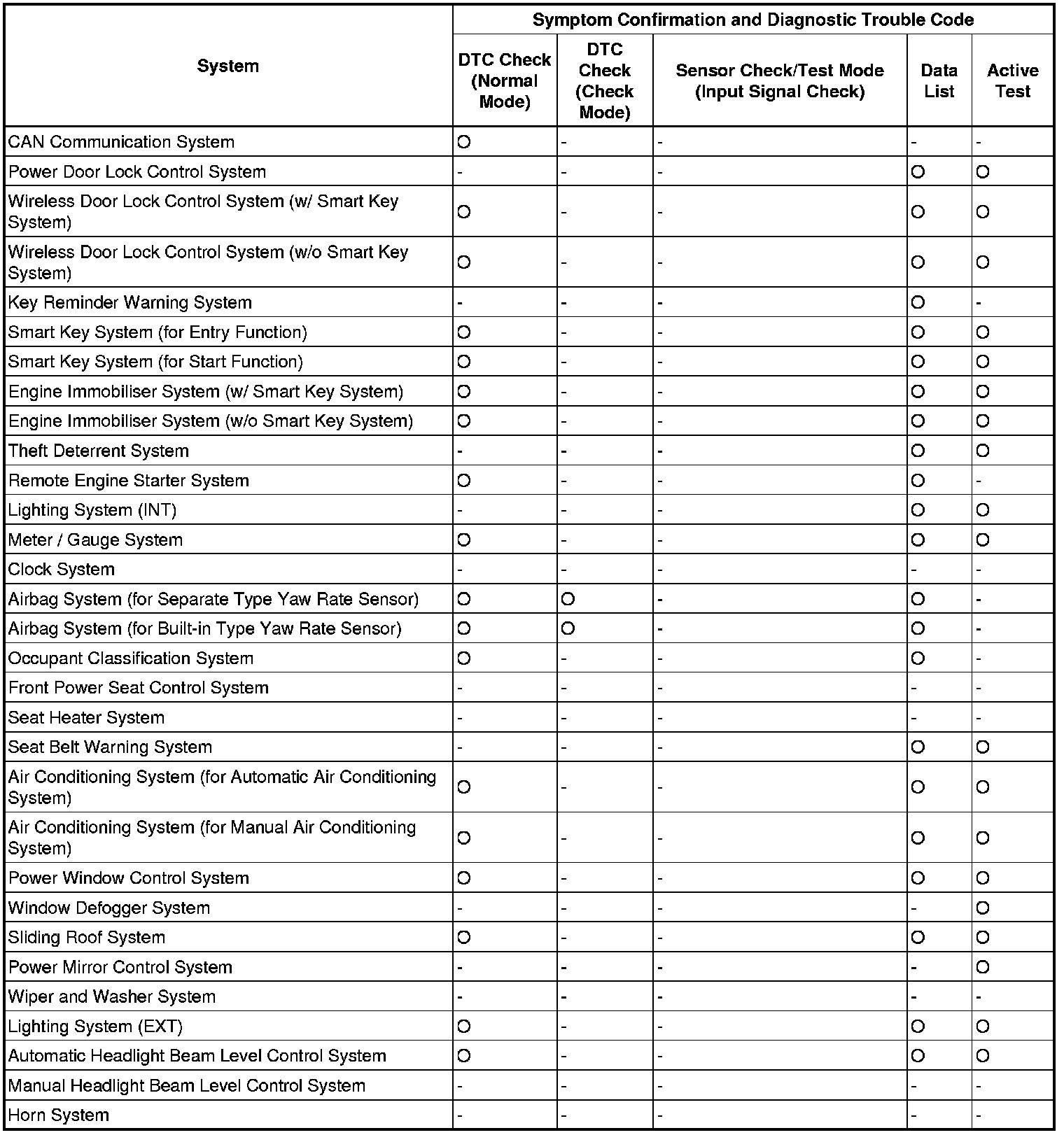 By using these functions, the problem areas can be narrowed down and troubleshooting can be more effective. Diagnostic functions are incorporated in the following systems of this vehicle.
