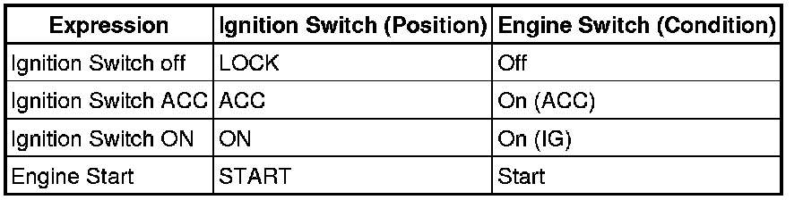(a) The type of ignition switch used on this model differs according to the specifications of the vehicle. The expressions listed in the table below are used in this section.