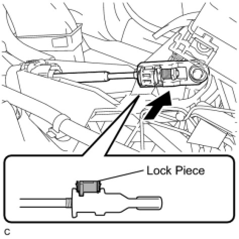 (f) Push the 2 claws together at the top of the transmission control cable lock piece. While holding the 2 claws together, push the 2 lugs on the bottom of the lock piece toward each other and upward to pull out the lock piece.