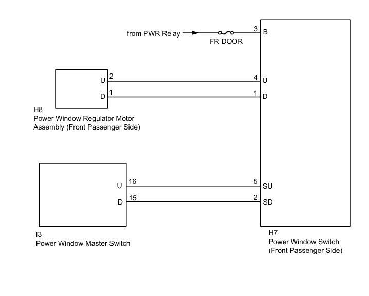 If the passenger side manual UP or DOWN function does not operate, a malfunction may exist in the power window regulator motor, power window switch, power window master switch or wire harness.