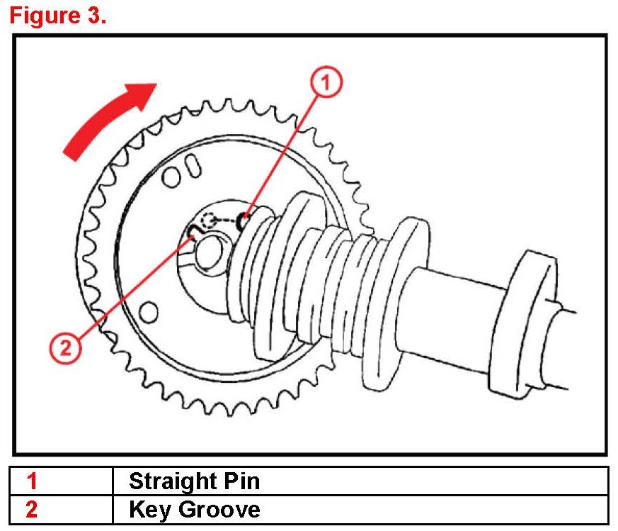 C. Install the timing gear assembly onto the camshaft with the straight pin slightly to the right of the key groove as shown in Figure 3.