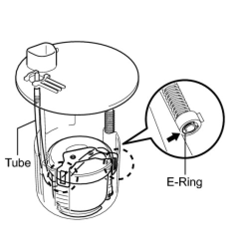 (e) Remove the E-ring and separate the 2 claws, then remove the fuel pump sub-tank.