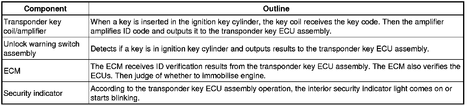 The engine immobiliser system is designed to prevent the vehicle from being stolen. This system uses the transponder key ECU assembly that stores the key codes of authorized ignition keys. If an attempt is made to start the engine using an unauthorized key, the ECU sends a signal to the ECM to prohibit fuel delivery and ignition, effectively disabling the engine.