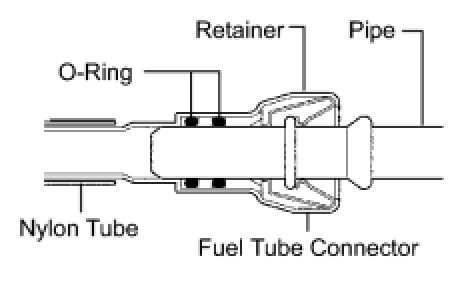 (1) Line up the two parts of the pipes to be connected, and fully push the fuel tube connector and pipe together until they are fully seated. Push the retainer into the connector until its claws lock. If the pipe is difficult to push into the connector, apply a small amount of clean engine oil to the tip of the pipe and reinsert it.