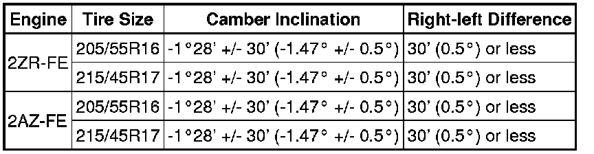 Camber is not adjustable. If the measurement is not within the specified range, inspect the suspension parts for damage and/or wear, and replace them if necessary.