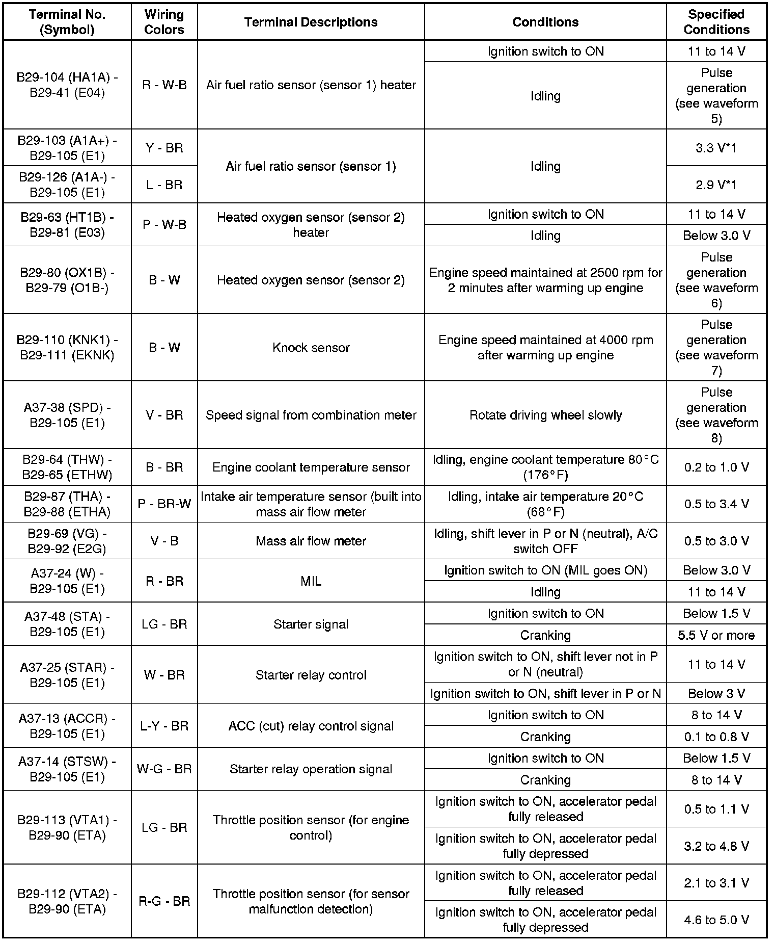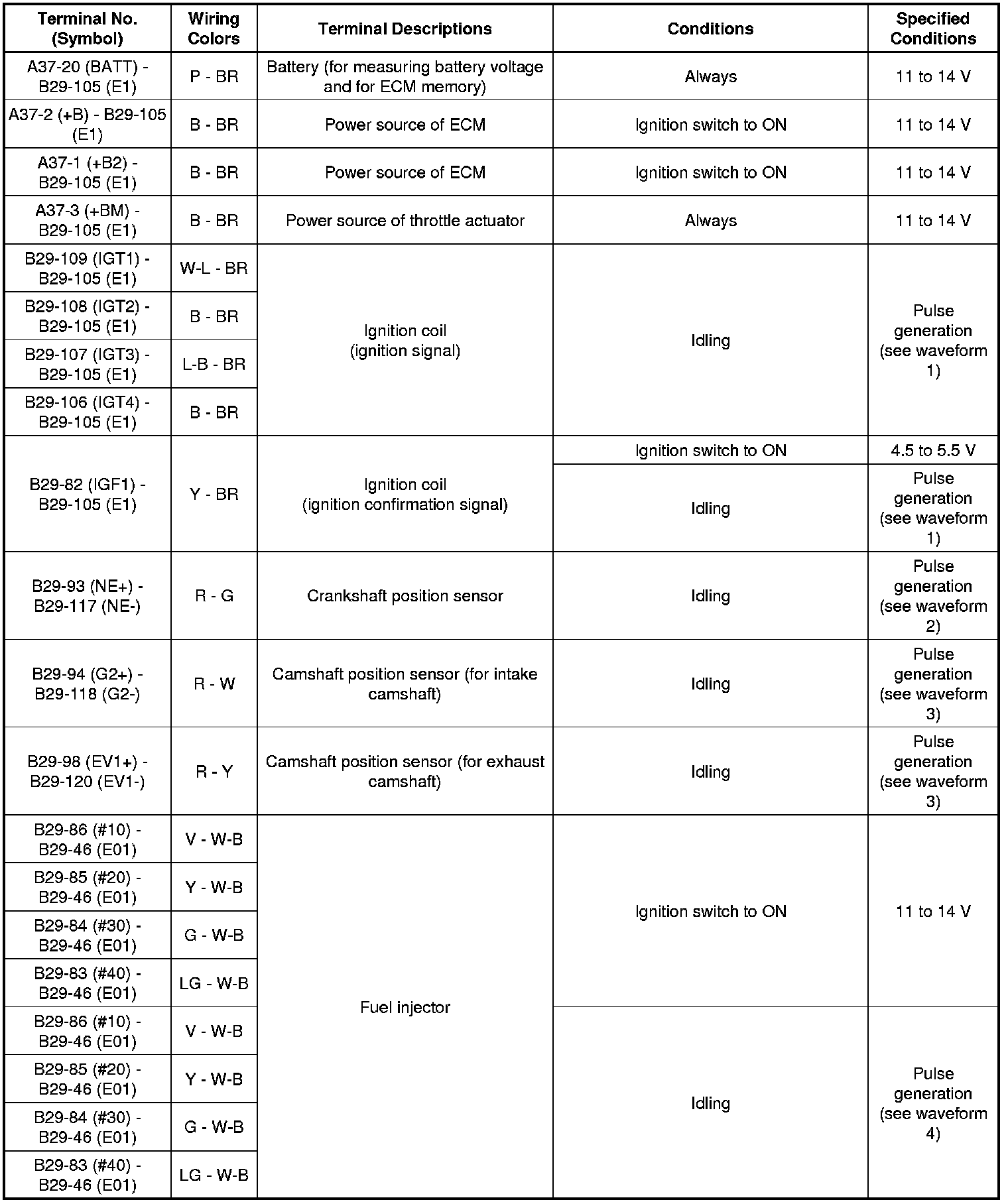 The standard normal voltage between each pair of the ECM terminals is shown in the table below. The appropriate conditions for checking each pair of the terminals are also indicated. The result of checks should be compared with the standard normal voltage for that pair of the terminals, and displayed in the "Specified Conditions" column. The illustration above can be used as a reference to identify the ECM terminal locations.