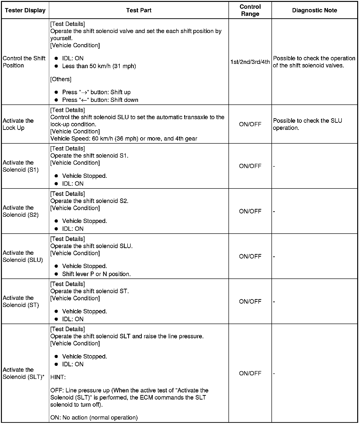 *: "Activate the Solenoid (SLT)" in the Active Test is performed to check the line pressure changes by connecting the SST to the automatic transaxle, which is used in the HYDRAULIC TEST Hydraulic Test as well.