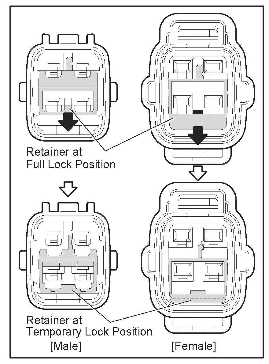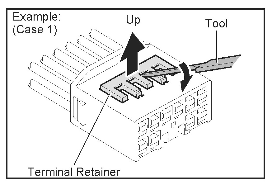 Insert the special tool into the terminal retainer access hole (Triangle Mark) and pull the terminal retainer up to the temporary lock position.