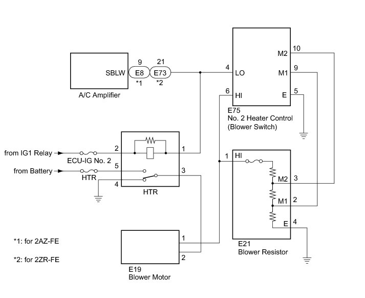 When the No. 2 heater control (blower switch) is operated, the HTR relay will turn on and send current to operate the blower motor. Operating the No. 2 heater control (blower switch) adjusts the flow of current between the blower resistor and body ground, thus, adjusting the speed of the blower motor.