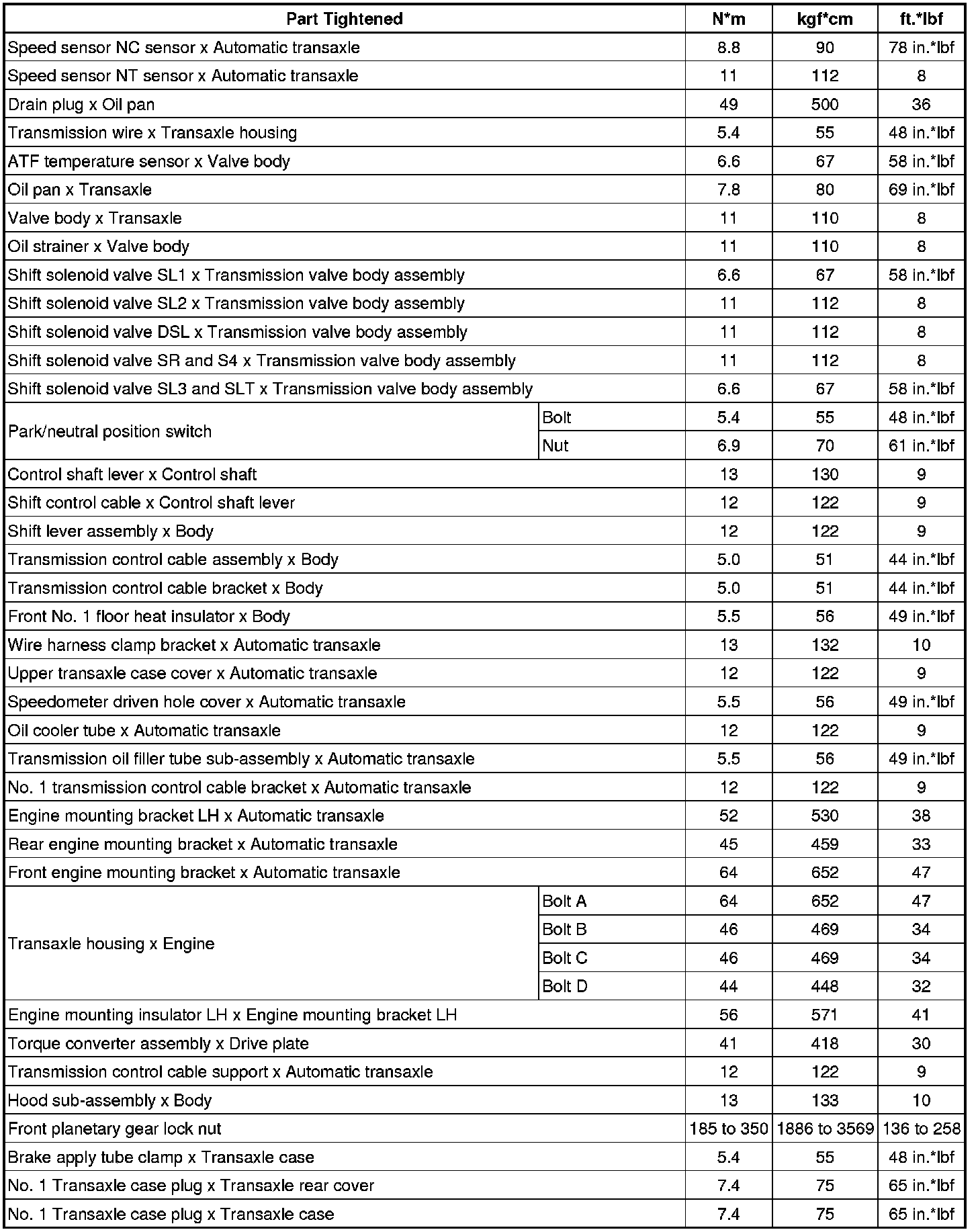 SPECIFICATIONS: U250E AUTOMATIC TRANSMISSION / TRANSAXLE: TORQUE SPECIFICATIONS
