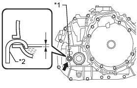 (e) Add transaxle fluid until the fluid level is between 0 to 10 mm (0 to 0.394 in.) from the bottom lip of the filler plug opening. [*5]