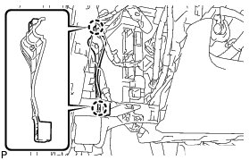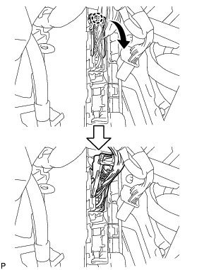 (e) Disengage the 2 claws and disconnect the wiring harness protector.