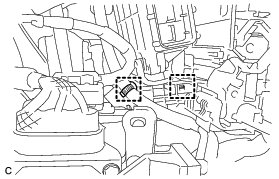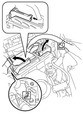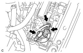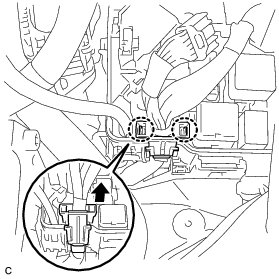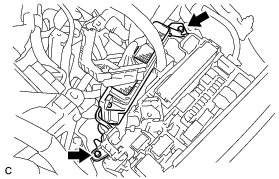 (c) Disengage the 2 claws, push up the engine room wire harness and separate it from the engine room relay block.