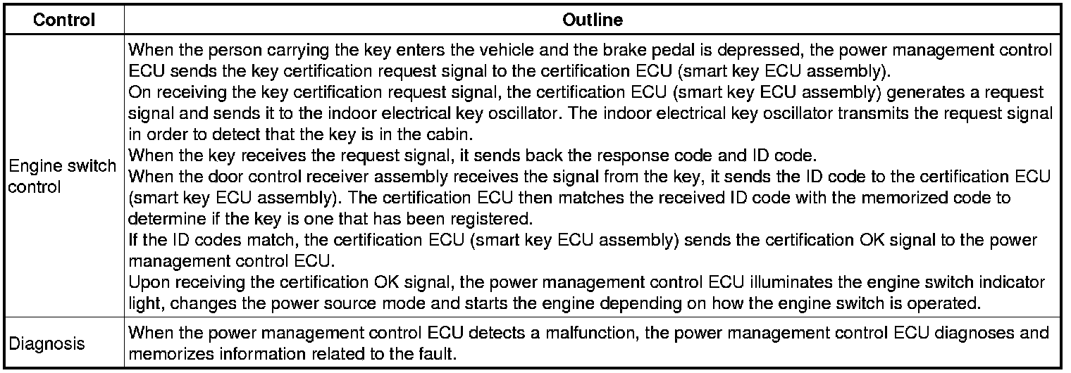 (a) The push-button start uses a push-type engine switch, which the driver can operate by merely carrying the electrical key. This system consists primarily of the power management control ECU, engine switch, steering lock ECU, electrical key, ACC relay, IG1 relay, IG2 relay and certification ECU (smart key ECU assembly). The power management control ECU controls the system. This function operates in cooperation with the smart key system.